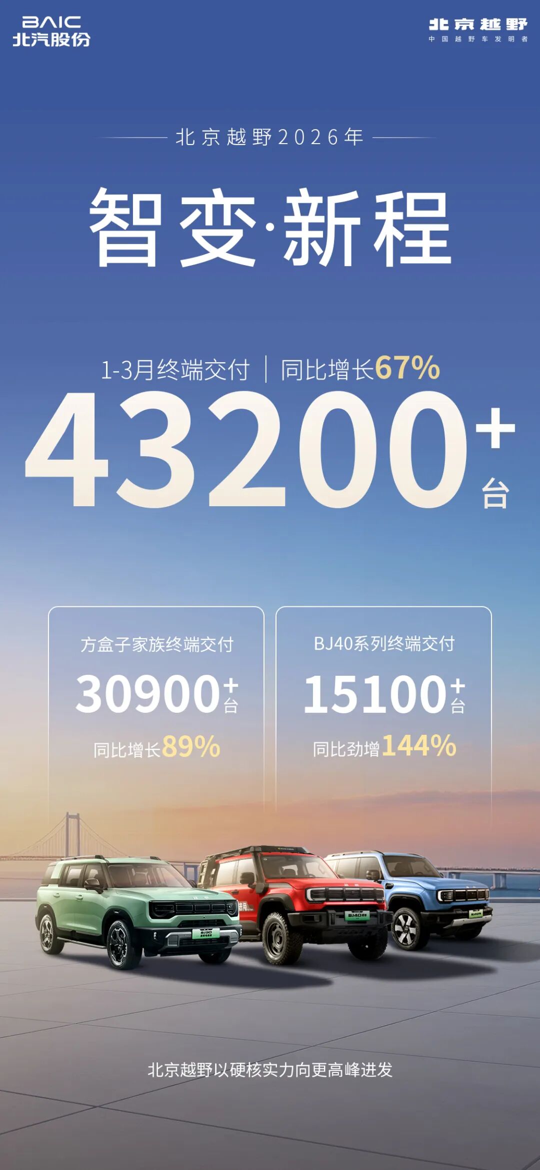 北京越野1-3月终端交付43200+台 同比增长67%